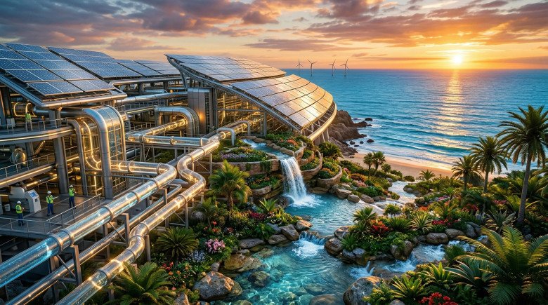 الخطوة الأولى والأكثر أهمية نحو الاستدامة تتمثل في فك الارتباط التاريخي بين تحلية المياه والوقود الأحفوري الملوث. يشهد القطاع توجهاً كاسحاً وواعداً نحو دمج محطات التناضح العكسي مع مصادر الطاقة المتجددة، وتحديداً الطاقة الشمسية وطاقة الرياح. أظهرت الأبحاث والدراسات الميدانية أن هذا التحول الجذري قادر على خفض الانبعاثات الكربونية الناتجة عن العملية بنسب مذهلة تتراوح بين تسعين إلى خمسة وتسعين بالمائة، مما يهبط بالبصمة الكربونية من مستويات كارثية لتصل إلى أرقام ضئيلة جداً تتراوح بين 0.1 إلى 0.3 كيلوجرام فقط من ثاني أكسيد الكربون لكل متر مكعب من المياه. هذا التزاوج بين الشمس والمياه المالحة سيجعل من إنتاج المياه العذبة الخضراء حقيقة واقعة ودرعاً حصيناً ضد التغير المناخي.